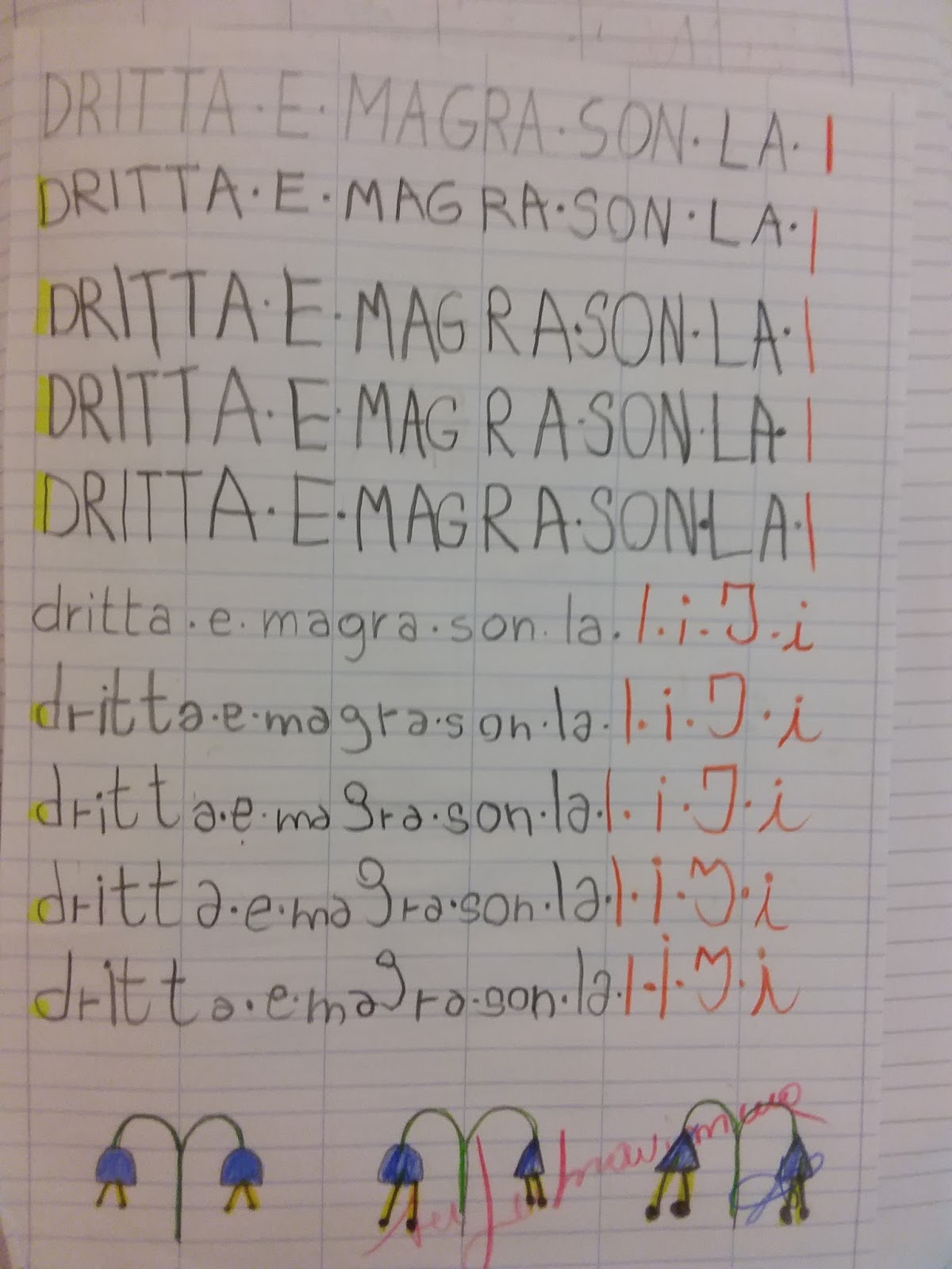 Cercavo però percorsi nuovi stimolanti e così mi sono imbattuta nel metodo analogico di Camillo Bortolato e mi sono procurata un pò di materiale: l'alfabetiere murale ad esempio che ho utilizzato molto, subito dopo aver verificato le competenze fonologiche dei bambini ( la capacità di riconoscere fonemi iniziali e finali, di segmentare una parola nei suoni che la compongono, di individuare una parola sentendo pronunciare le sillabe e poi le lettere che la compongono ecc.).